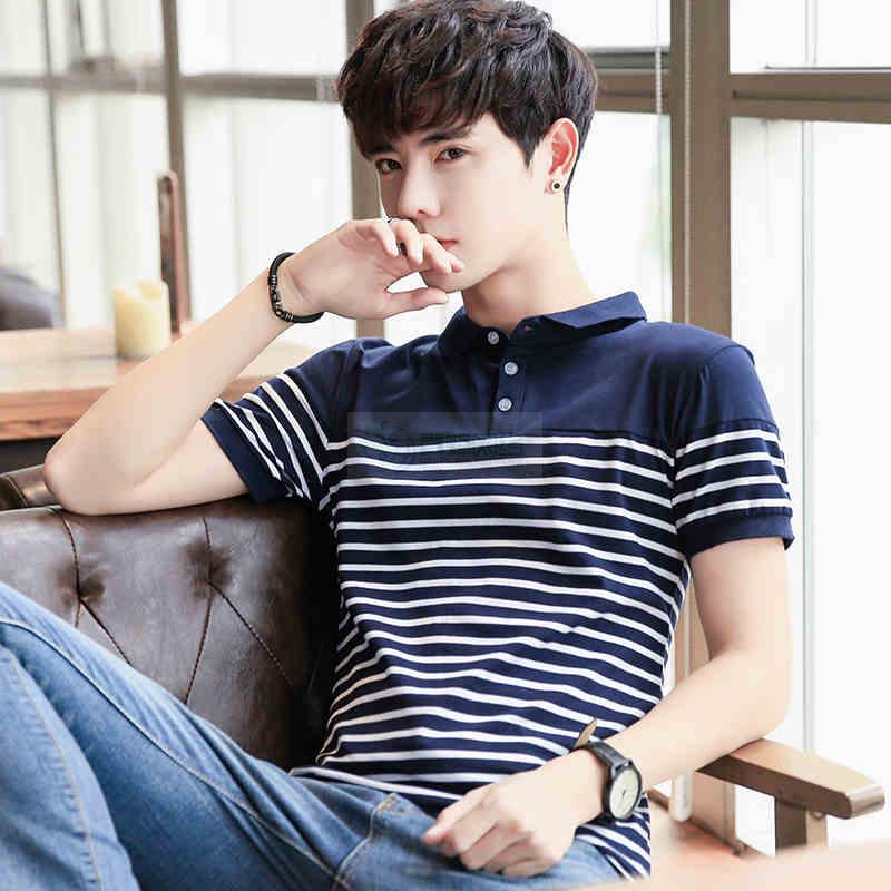 夏季男士短袖t恤 翻领条纹polo衫男修身韩版潮流半袖体恤男...